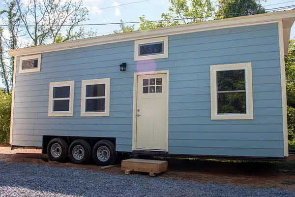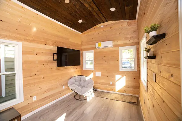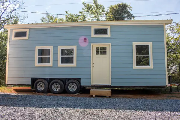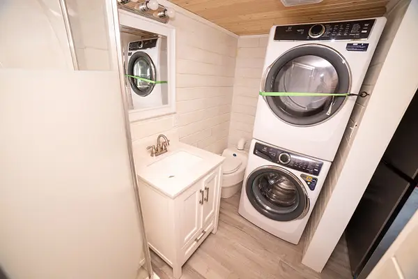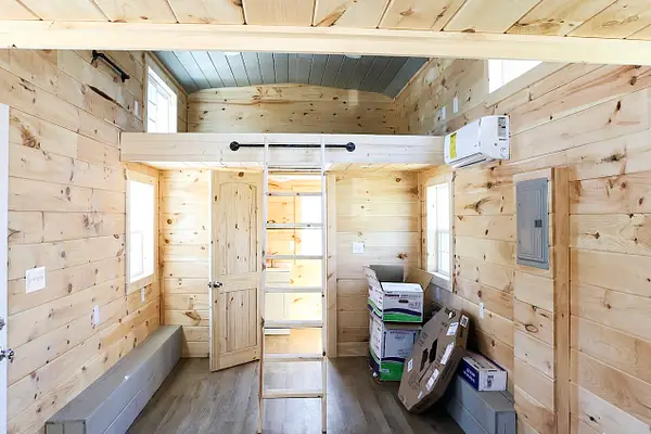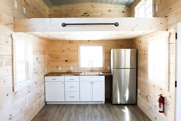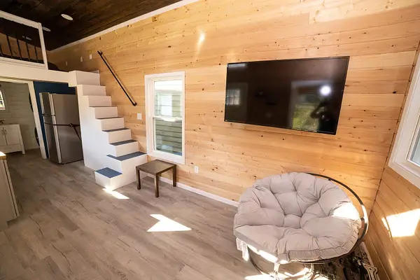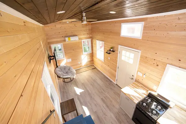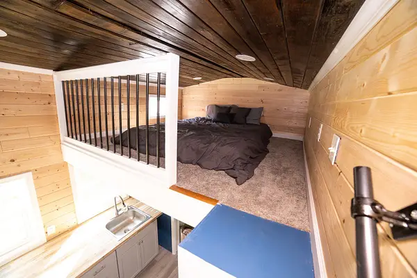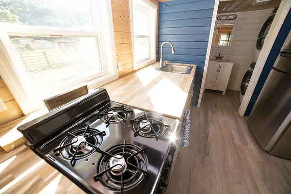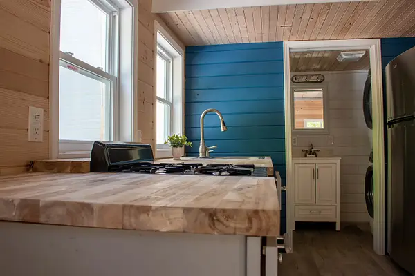Vibrant blue accents, warm natural wood walls, and a dusted grey floor create a cozy, inviting atmosphere. With 280 square feet on the main floor and two lofts, this home offers both spaciousness and versatility. The kitchen features Grey Diamond cabinets and butcher block countertops, seamlessly connecting to the living space. The bathroom boasts a stylish ½ hex fiberglass shower and a 24” white vanity. “Blue Beauty” is not just a home; it’s a retreat waiting to welcome you into its warm embrace